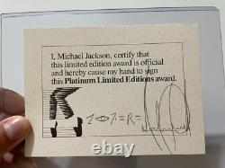 Michael Jackson Signed Inscribed Autographed Certificate EPPERSON COA. Jackson has also added an inscription of an equation of what appears to be a 7, an eye, another 7, an equal sign, an R, and another equal sign. Measures 4 1/8 x 5 5/8 inches. This has been authenticated by Roger Epperson, the world's foremost music autograph authenticator, and comes with his letter of authenticity.