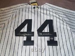 Reggie Jackson autographed New York Yankees jersey with Jackson authentication Sig. Like-new Nike MLB Authentic Collection size 48 Reggie Jackson New York Yankees jersey has been signed "Reggie Jackson" on one back number and Mr. A Reggie Jackson Authenticated sticker is affixed to the number, and a basic cert and Mr.